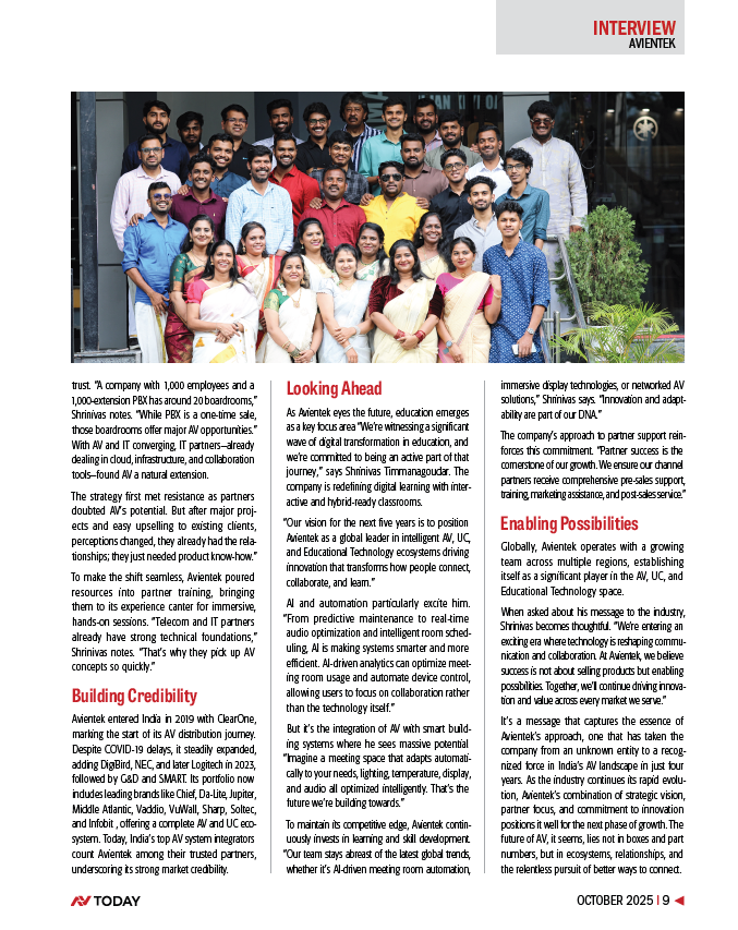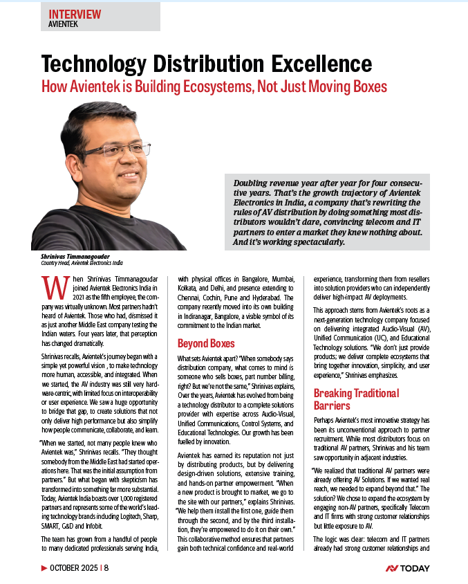Avientek Electronics in India is redefining the landscape of Audio-Visual (AV) and Unified Communications (UC) technology distribution. Under the leadership of Country Head Shrinivas Timmanagoudar, the company has driven remarkable growth doubling revenue year after year for four consecutive years. This success stems from a strategic shift away from simply “moving boxes” to building holistic technology ecosystems that enhance collaboration, learning, and overall user experience. By forging strong partnerships with both AV and non-AV IT firms, Avientek is tackling market barriers and positioning itself as a leader in delivering integrated, end-to-end solutions.